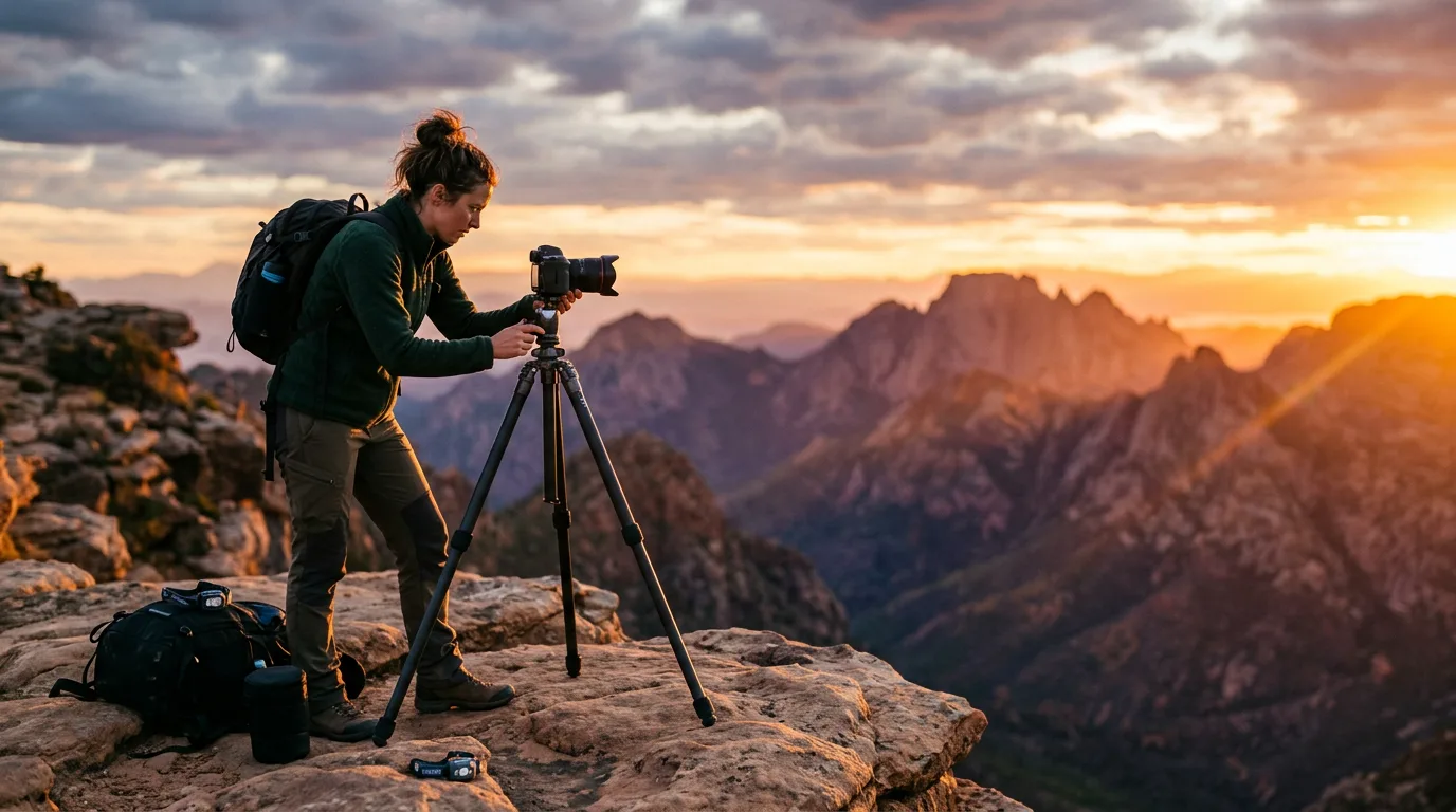 A tripod is not optional for scenic photography at the highest quality level. Handheld shooting at f/8 and 1/250s produces acceptable results. But the conditions that define great outdoor light — dawn, dusk, blue hour, overcast skies — demand shutter speeds of 1/30s to multiple seconds. No amount of image stabilization substitutes for a solid three-legged platform at those speeds.